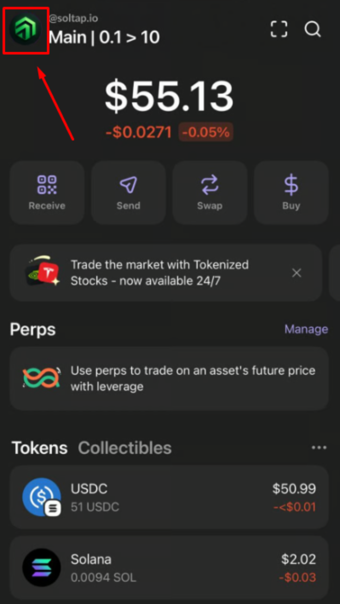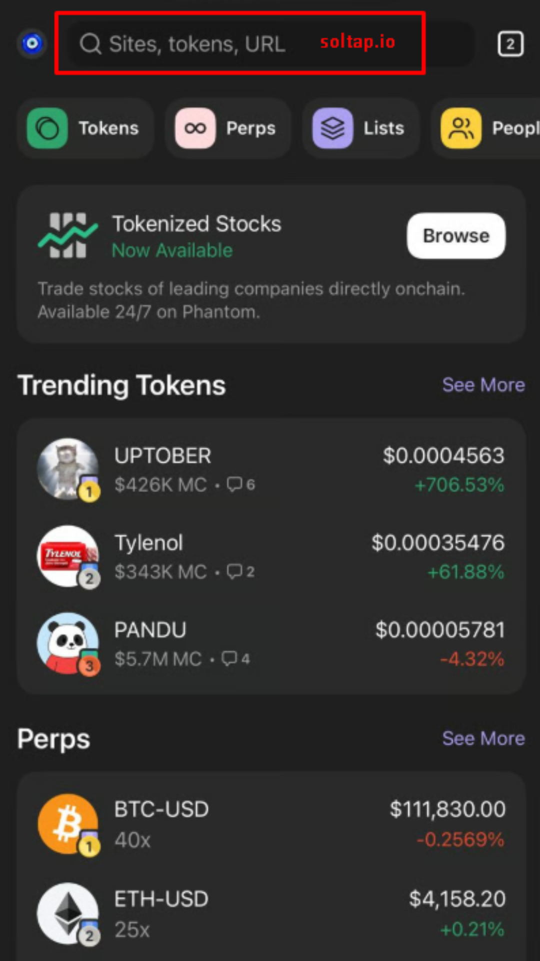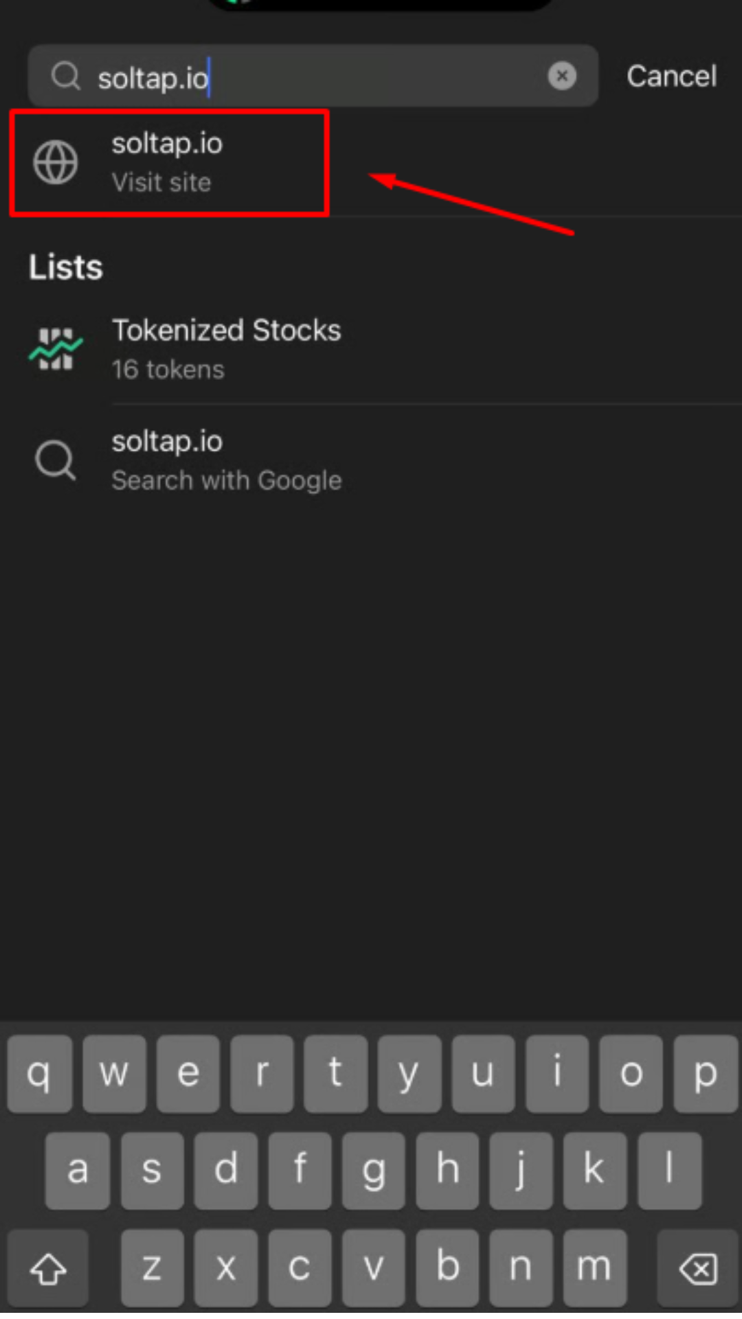 Click on browser icon -> Type soltap.io in the search box above -> Click on SolTap -> Connect Wallet.