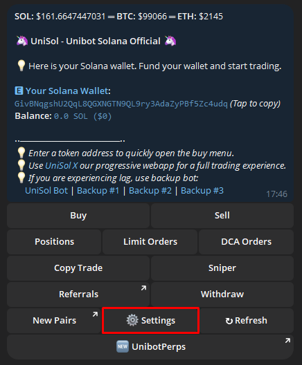 - Click on Add/Connect Wallet -> Import Private Key, and paste the private key you copied on the Unibot/Unisol.